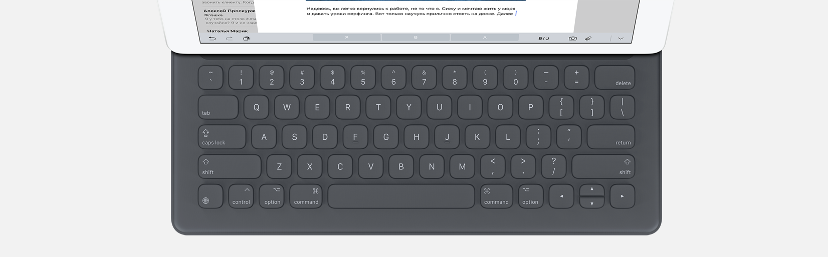 Специально для Pro версии Apple разработала уникальный чехол-клавиатуру и «умный» стилус с «оригинальным» названием Pencil. В последнем купертиновцы реализовали технологию, считывающую положению, силу нажатия и угол наклона пера. Что касается механизма крепления чехла-клавиатуры, то он пришел прямиком из новых MacBook.