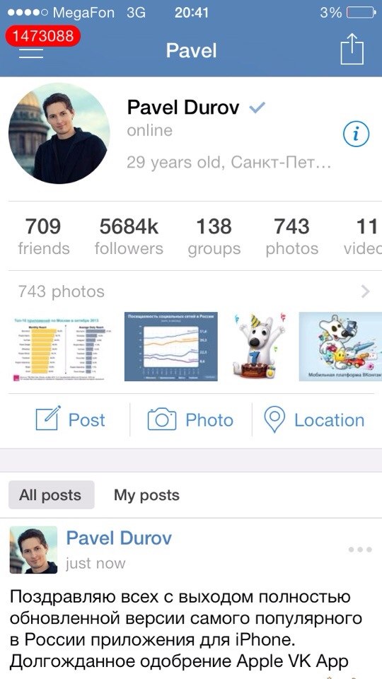 24 сентября на стене основателя социальной сети появилась запись о том, что его команда уже работает над новым приложением. Также в своем сообщении Павел Дуров заявил о том, что в приложении будет изменен каждый экран, из-за этого они как будто полностью переписывают приложение. Ладно, поверим. Но 27 ноября на той же странице появляется запись о том, что модераторы App Store отклоняют новое творение Павла. Если этому всему верить, то выходит, что приложение разрабатывалось 2 месяца и почти месяц пыталось попасть в App Store.